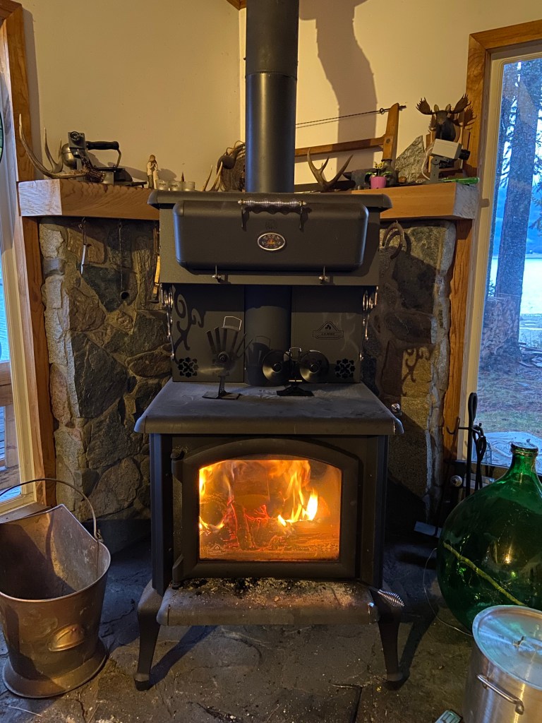 This weekend, my husband and I are at our cabin at Arrow Lake. Over the winter, the water is shut off, and we have to haul water in big jugs from home. The wood stove provides heat.