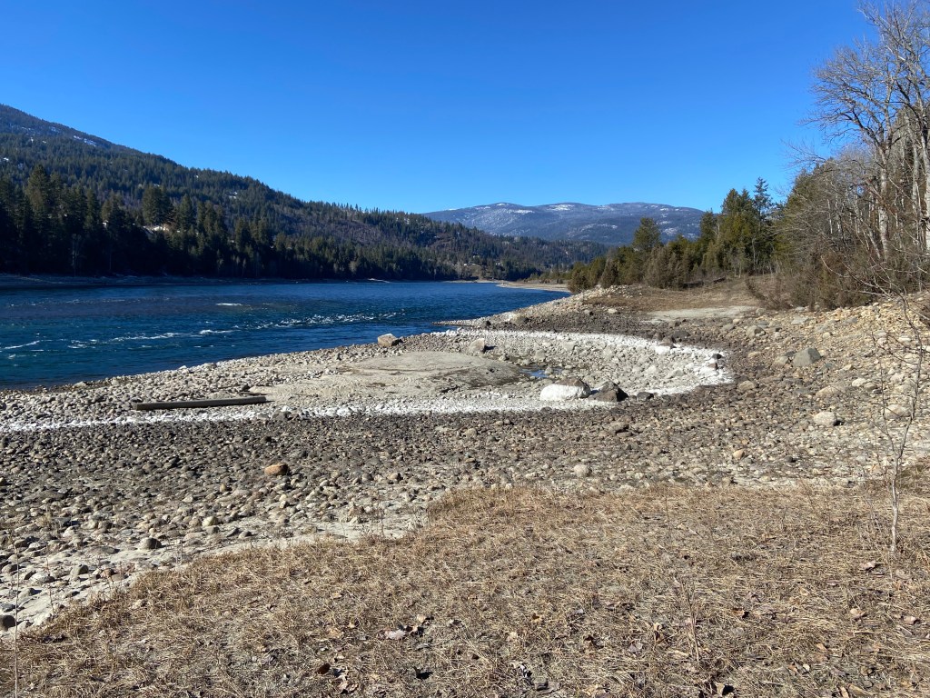 The Columbia River is exceptionally low downstream of the Hugh Keenleyside Dam this week. Parts of shoreline that aren’t normally visible are dry, like this eddy along the Selkirk College trails.